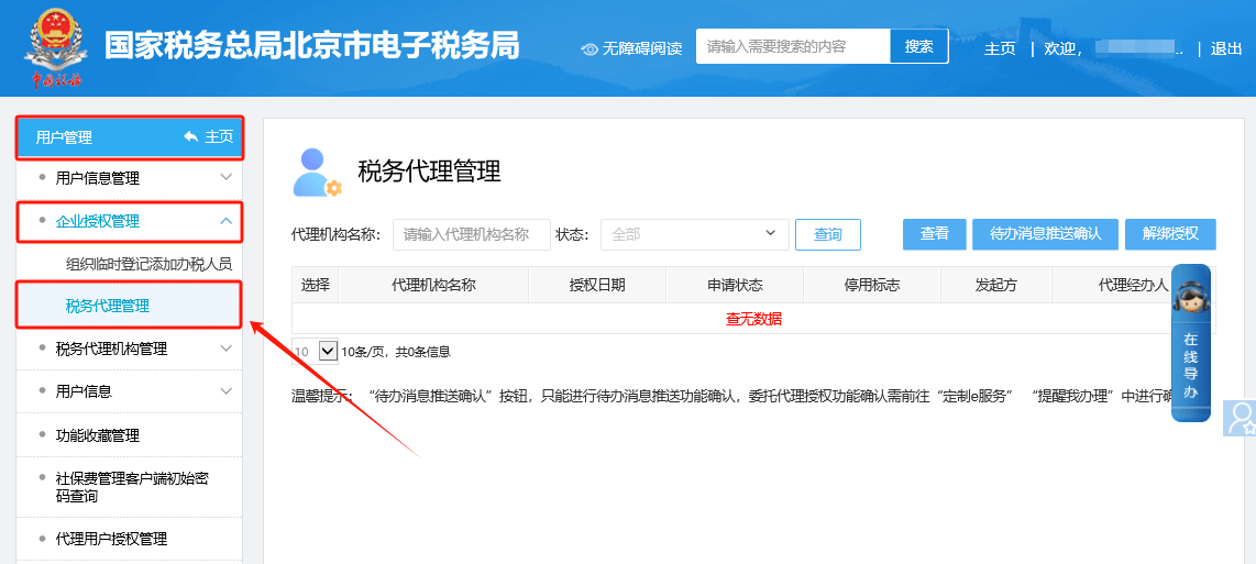 二、用戶管理—企業(yè)授權(quán)管理—稅務(wù)代理管理進行確認。