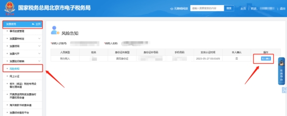 二、發票使用—風險告知,進入雙向實名認證模塊(此處只顯示當前登錄人員的信息,所以需要給誰做雙向實名認證,則需要使用該人員的信息驗證登錄),點擊【本人確認】。